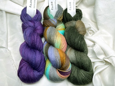 All the colorways are dyed in skeins of Merino Cloud, a light fingering weight yarn, made up of 80% extrafine merino + 20% cashmere and with 437 yards (44m) per 100g skein.