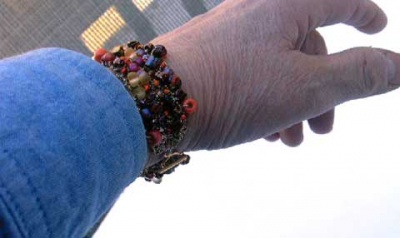 Here is a bracelet to knit which makes use of all those colors with occasional surprises and peeks of other hues, all to be strung on a gold-ish thread with a golden spring clasp or lobster clasp as the closure. Or a toggle clasp; your choice.