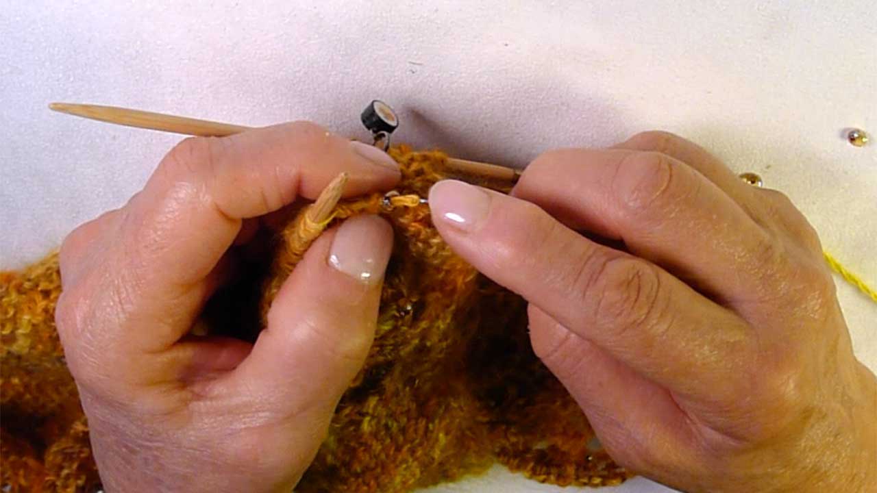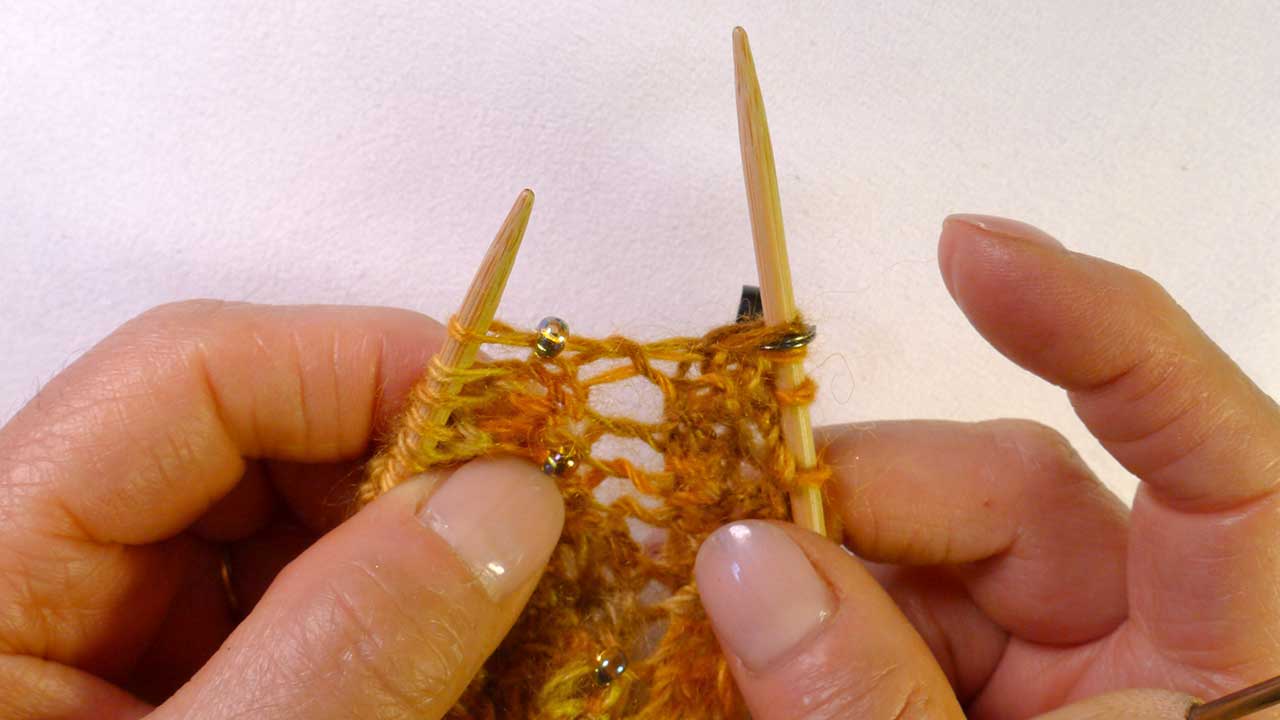 From the left-hand needle, capture the stitch you want to add the bead to.