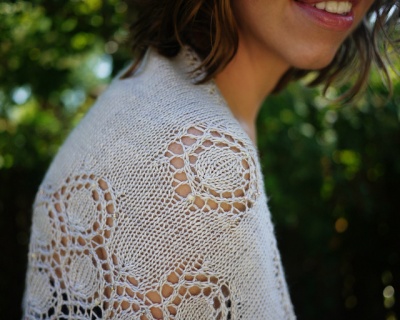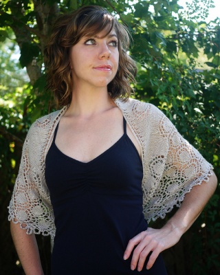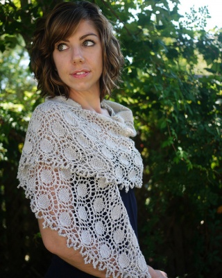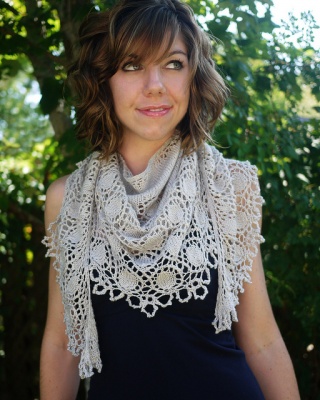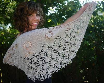 "A lacy crescent-shaped shawlette knit in a luminous merino/silk blend yarn. Beads shimmer along the edges of lace bubbles, perfect for special occasions or adding a little sparkle to your every day wardrobe.