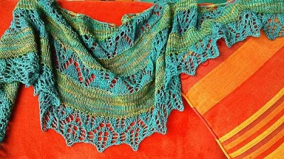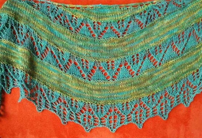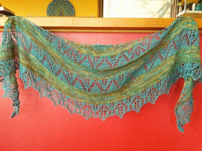 How much do you need? The shawl that Nim made (that you see in the photos on this page) used 180 yards (165 m) of the tonal greens plus 140 yards (128 m) of the teal that makes up the lace work. The finished measurements are 66 x 15" (170 x 38 cm).