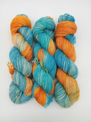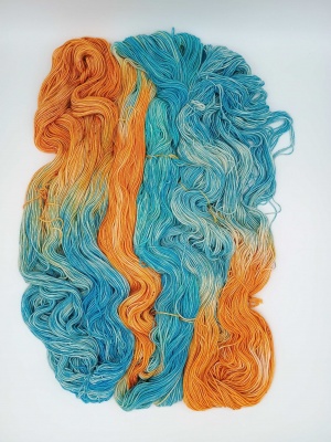 Blue and orange are complimentary colors that enhance each other and make for a very striking contrast. This colorway is varying tones of turquoise (lights and mediums and darks) plus vibrant sorbet colors -- I see apricot and peach and a bit of lemon too.