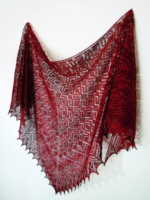 The original shown here in red was knit in lace weight yarn -- you will need 800 yards to duplicate this size which is a medium. If you would like to make the large one (blue shown here), figure on 1050 yards of lace weight yarn. And for the small, go for about 650 yards. It would also look great knit in fingering weight. Go for a solid yarn or an almost-solid or a tone-on-tone so the intricacy of the lace work will be visible.