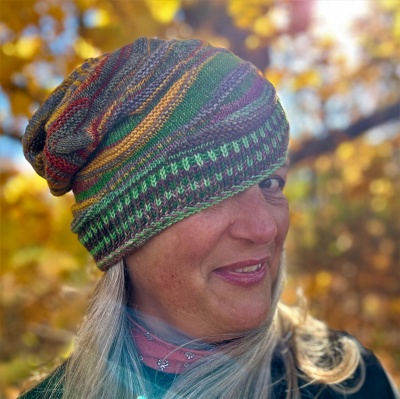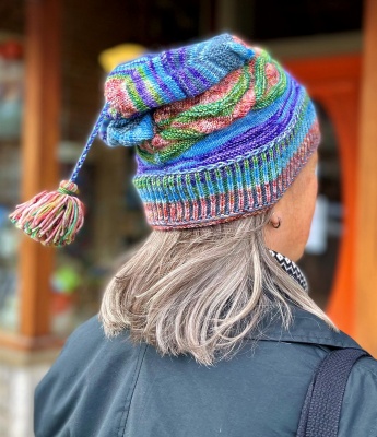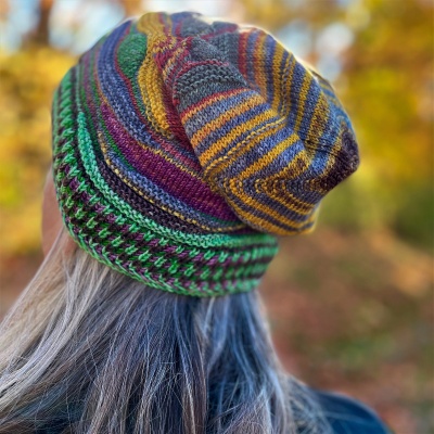 A full hat knit using short rows to create a marvelous palette of colors. The hats you see on this page were knit using one skein of Uneek Fingering -- the same yarn as we offer in these kits though our colorway is different than the ones you see here.