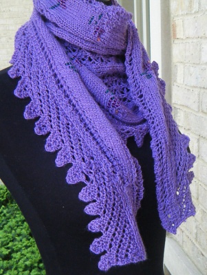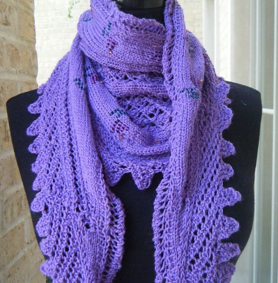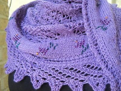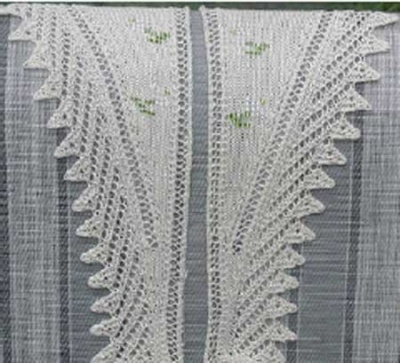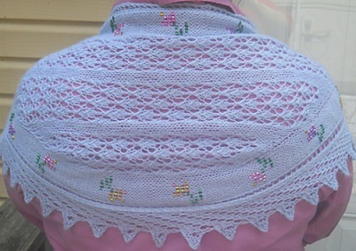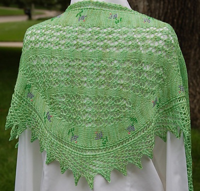 Gwen's Garden is a shawl with a gentle curve to it. I think that it is what is called a crescent shape as compared to a triangle with a point at the end -- a shape I much prefer personally and find more flattering in general. Done with only 400 yards more or less of fingering weight yarn, the design has beads added (via the crochet-hook method) to make twenty-four lovely flower motifs.