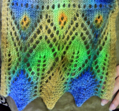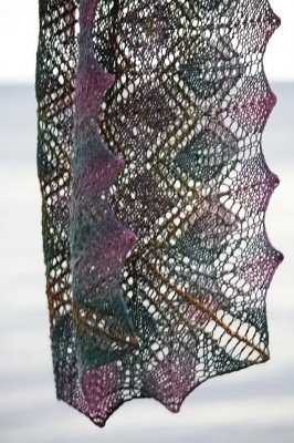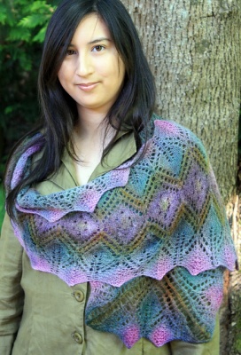 The Diamond Leaf Wide Lace Scarf (shown in the two photos below those) uses 500 yards of a similar yarn. The finished size of the Diamond Leaf is 62" x 16".