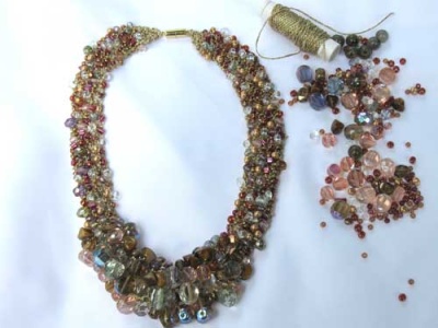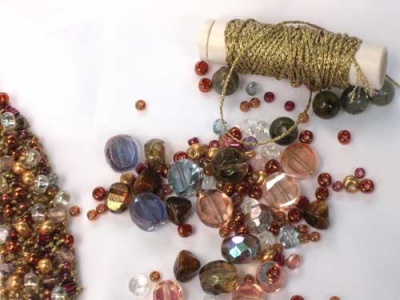 We stated out with a 20 meter spool of Tapestry Braid #12 in a gold; silk also works beautifully. The mix of beads tends to change with every mix, to be honest. All ones that struck us as perfect for the overall look.