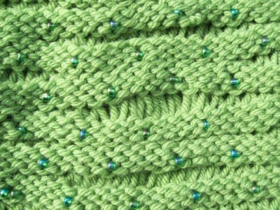 "It's constructed with "mountains" of reverse stockinette stitch with "valleys' of drop stitch lace, and accents of sparkling silvery beads.