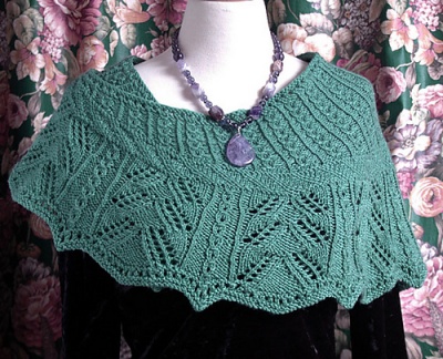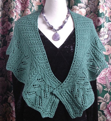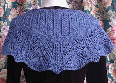 Short rows patterned in mock cable lace shape the shawl into a crescent which sits elegantly on the shoulders.