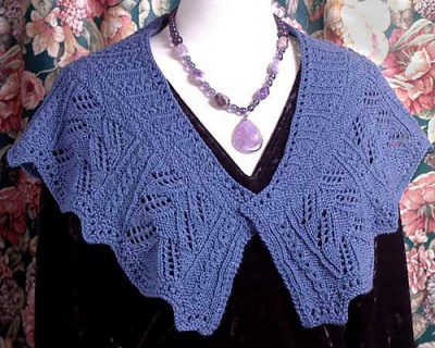 Knit in DK weight, the shawl drapes in lacy swirls (that is the piece shown as knit in green teal). Knit in fingering weight, the shawl can be decoratively joined in the center (shown as knit in blue-violet).