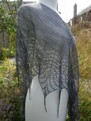 This pattern has been specifically written for a 400m skein of yarn in lace weight though it is very easy to make it larger. And Bev mentions that it can also be knit in fingering weight -- a less lacy effect will be produced. If you would prefer a larger size then you would need more yardage. (The finished size after agressive blocking of the one you see here is roughly 83" [212 cm] along the top edge and 20.5" [52 cm] deep) Bev points out that with a stocking stitch body and repeatable lace section you will have no trouble at all knitting your shawl to a size and combination that suits you.