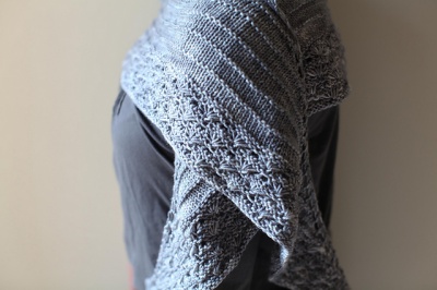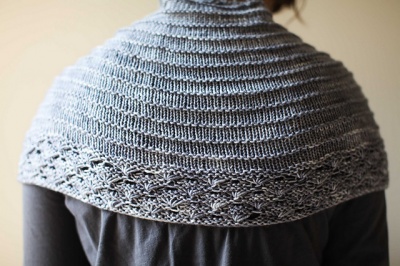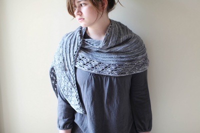 This one is called Stucco and is a crescent-shaped shawlette with a ridged body and delicate shell border made with elongated stitches that are fun to knit.