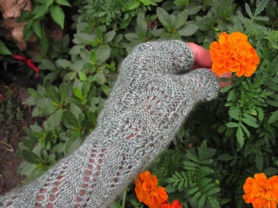 "Terzetto Lace Mitts are named for the threesome of lace stitch patterns used in their design. Let this trio of lace stitches sing to you while knitting and wearing these elegant near elbow-length Victorian style fingerless gloves."