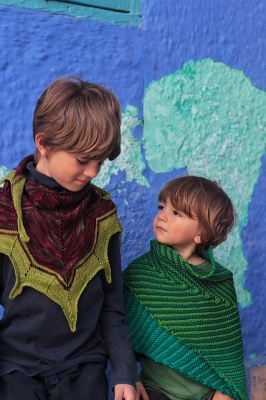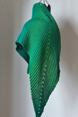 Veer Left is a striped elongated half hexagon shape in drapey, stretchy garter. It is designed to be knit on the go, with a short, easy to memorise sequence of rows which is repeated, gradually increasing the width of the shawl until a percentage of the yarn is used, at which point the knitting veers off to the left and decreases down to the far side.