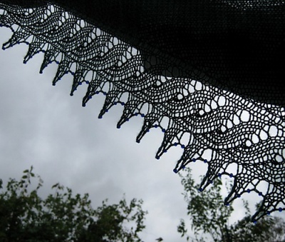 The body of the shawl is worked in simple garter stitch and its lace is easy enough even for a beginner lace knitter. Beads are added to the edge stitches for extra drape and sparkle; however, the shawl looks great even without the beads. If desired, instead of beading every right side row, a single bead can be added to each tip of the lace edging – simply add a bead only to Row 7 of the lace.